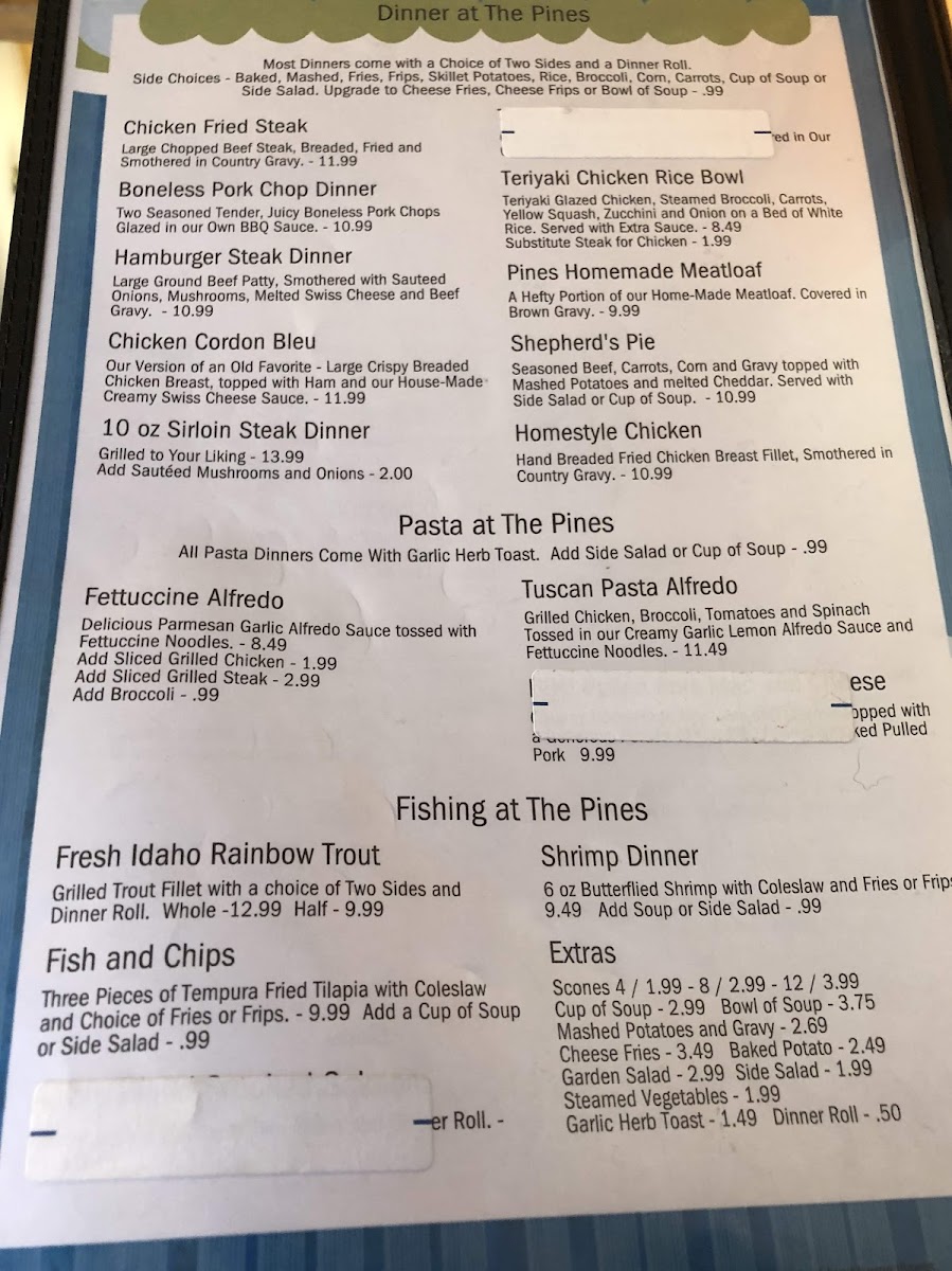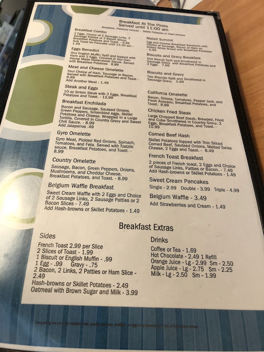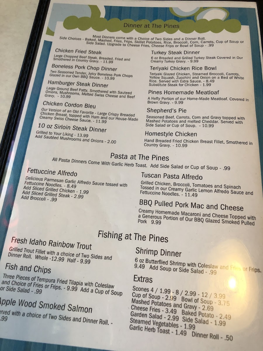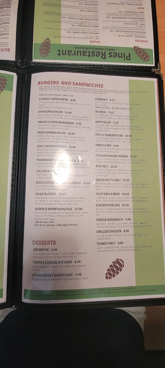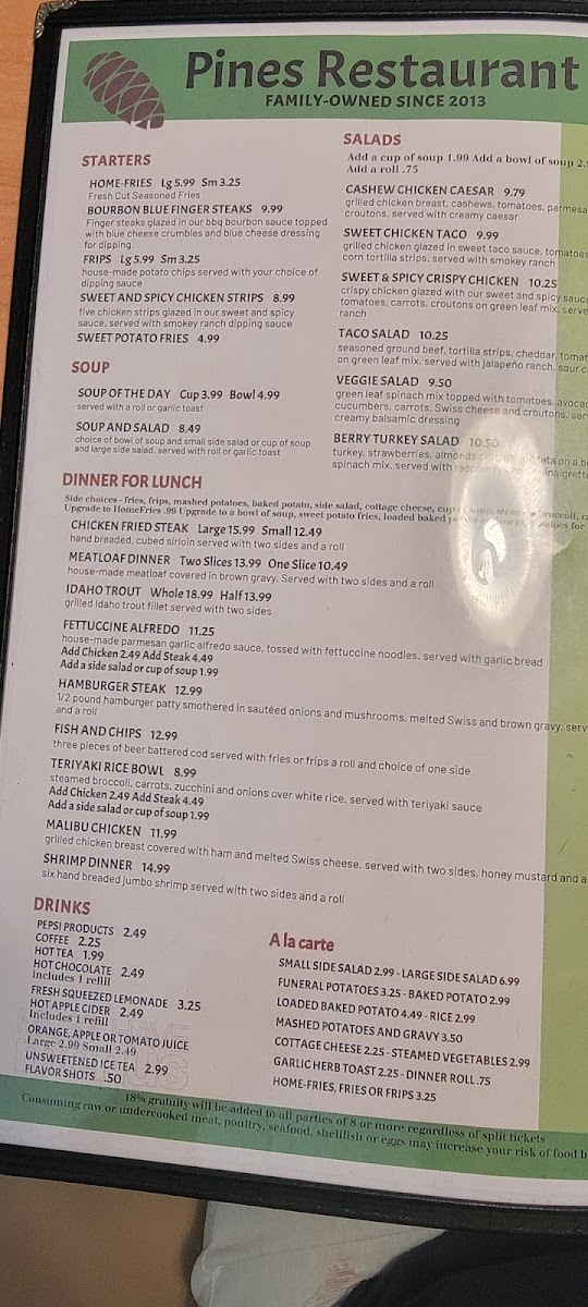 Start your meal with enticing options like the Bourbon Blue Finger Steaks or a Berry Turkey Salad. Don't forget to sip on their Hot Apple Cider, especially on cooler days. Reviews highlight the welcoming atmosphere and friendly service, making each visit a delightful experience. Whether you're enjoying a family dinner or a relaxing lunch, The Pines Restaurant aims to leave a lasting impression with each dish served.